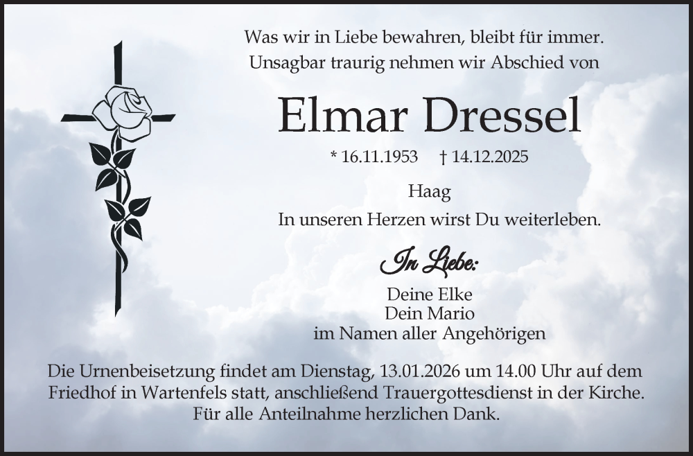 Hier finden Sie alle Traueranzeigen aus der Zeitung, die bisher für Elmar Dressel erschienen sind. Weitere Traueranzeigen, die in der Zeitung erscheinen, werden hier ebenfalls aufgelistet