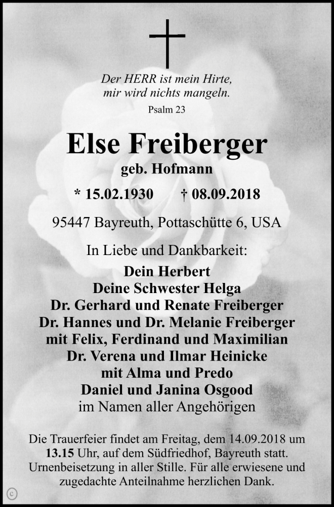 Hier finden Sie alle Traueranzeigen aus der Zeitung, die bisher für Else Freiberger erschienen sind. Weitere Traueranzeigen, die in der Zeitung erscheinen, werden hier ebenfalls aufgelistet
