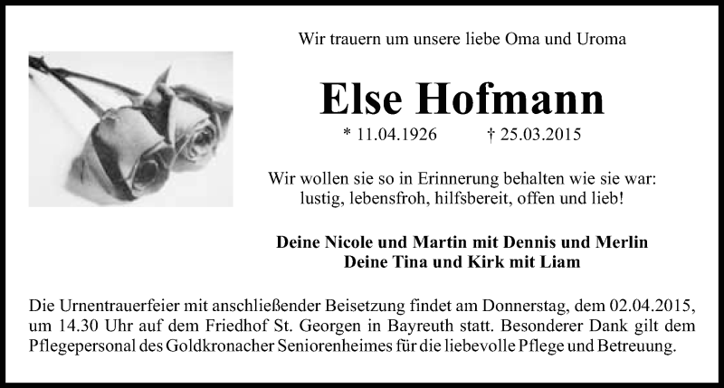 Hier finden Sie alle Traueranzeigen aus der Zeitung, die bisher für Else Hofmann erschienen sind. Weitere Traueranzeigen, die in der Zeitung erscheinen, werden hier ebenfalls aufgelistet