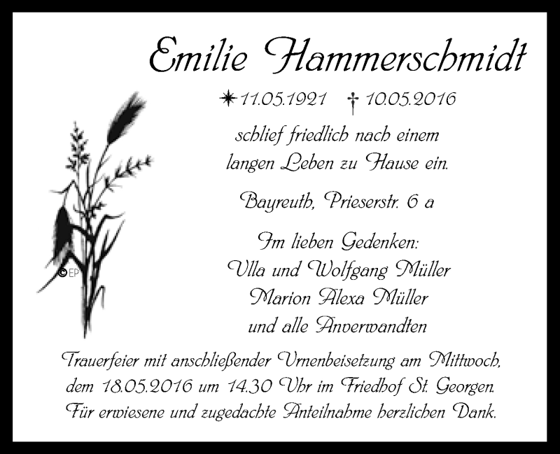 Hier finden Sie alle Traueranzeigen aus der Zeitung, die bisher für Emilie Hammerschmid erschienen sind. Weitere Traueranzeigen, die in der Zeitung erscheinen, werden hier ebenfalls aufgelistet