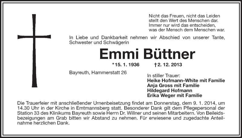 Hier finden Sie alle Traueranzeigen aus der Zeitung, die bisher für Emmi Büttner erschienen sind. Weitere Traueranzeigen, die in der Zeitung erscheinen, werden hier ebenfalls aufgelistet