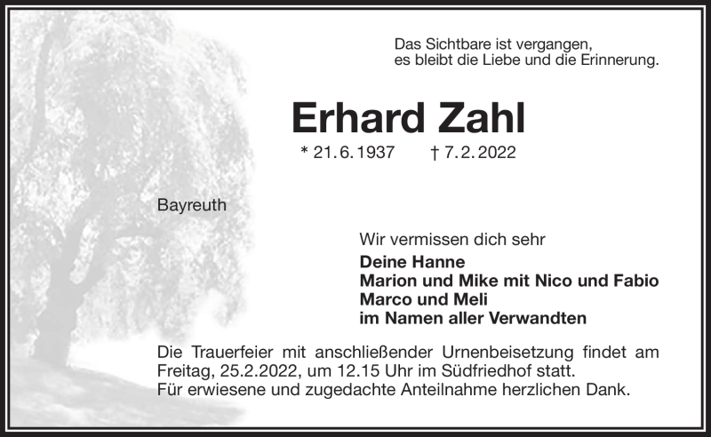 Hier finden Sie alle Traueranzeigen aus der Zeitung, die bisher für Erhard Zahl erschienen sind. Weitere Traueranzeigen, die in der Zeitung erscheinen, werden hier ebenfalls aufgelistet