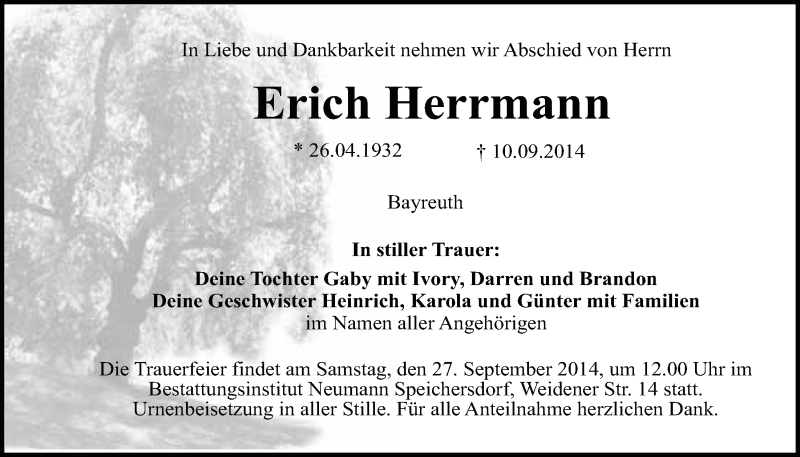 Hier finden Sie alle Traueranzeigen aus der Zeitung, die bisher für Erich Herrmann erschienen sind. Weitere Traueranzeigen, die in der Zeitung erscheinen, werden hier ebenfalls aufgelistet