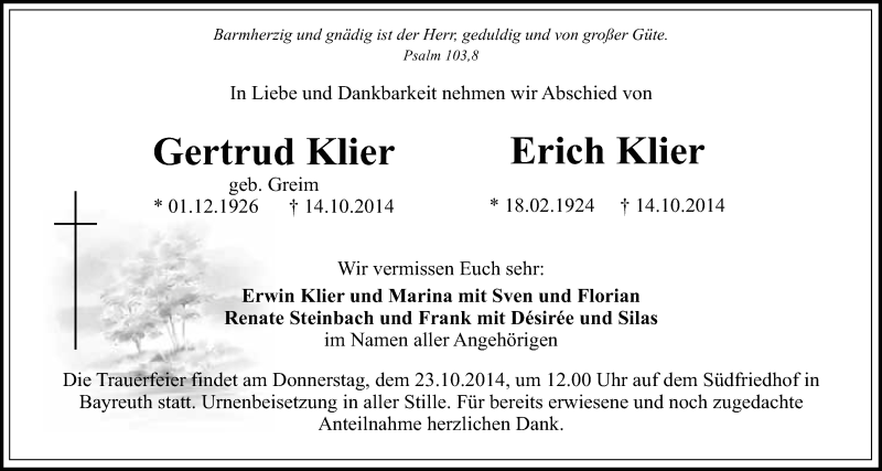 Hier finden Sie alle Traueranzeigen aus der Zeitung, die bisher für Erich Klier erschienen sind. Weitere Traueranzeigen, die in der Zeitung erscheinen, werden hier ebenfalls aufgelistet