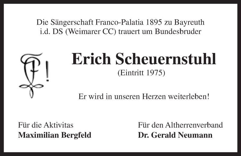 Hier finden Sie alle Traueranzeigen aus der Zeitung, die bisher für Erich Scheuernstuhl erschienen sind. Weitere Traueranzeigen, die in der Zeitung erscheinen, werden hier ebenfalls aufgelistet