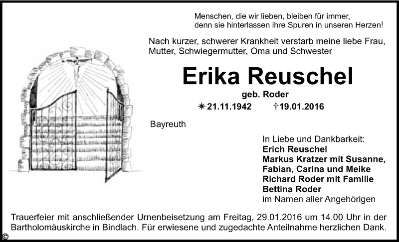 Hier finden Sie alle Traueranzeigen aus der Zeitung, die bisher für Erika Reuschel erschienen sind. Weitere Traueranzeigen, die in der Zeitung erscheinen, werden hier ebenfalls aufgelistet