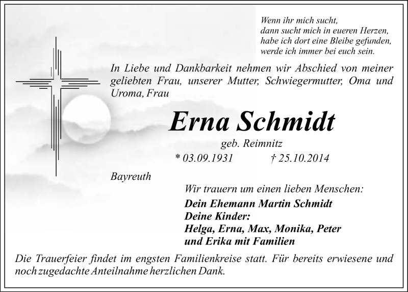 Hier finden Sie alle Traueranzeigen aus der Zeitung, die bisher für Erna Schmidt erschienen sind. Weitere Traueranzeigen, die in der Zeitung erscheinen, werden hier ebenfalls aufgelistet