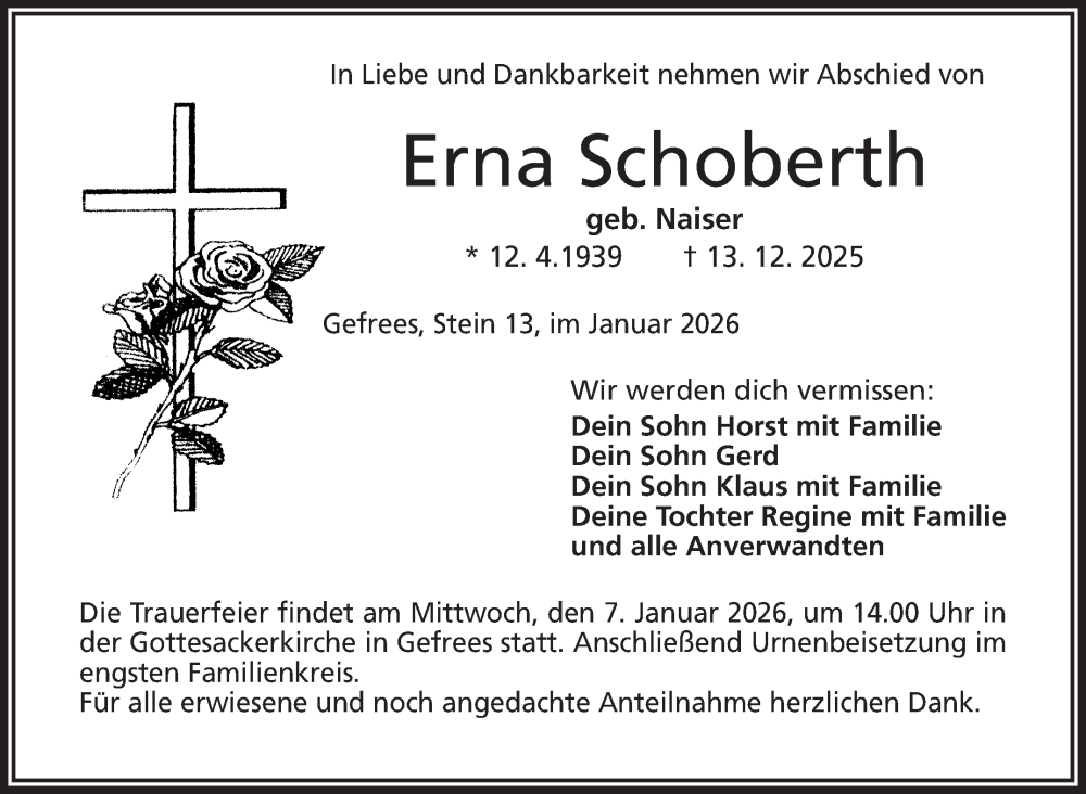 Hier finden Sie alle Traueranzeigen aus der Zeitung, die bisher für Erna Schobert erschienen sind. Weitere Traueranzeigen, die in der Zeitung erscheinen, werden hier ebenfalls aufgelistet