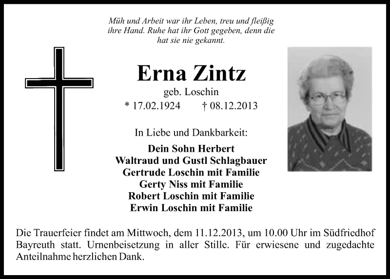 Hier finden Sie alle Traueranzeigen aus der Zeitung, die bisher für Erna Zintz erschienen sind. Weitere Traueranzeigen, die in der Zeitung erscheinen, werden hier ebenfalls aufgelistet