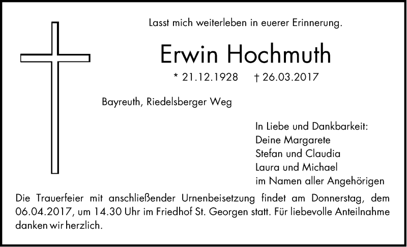 Hier finden Sie alle Traueranzeigen aus der Zeitung, die bisher für Erwin Hochmuth erschienen sind. Weitere Traueranzeigen, die in der Zeitung erscheinen, werden hier ebenfalls aufgelistet