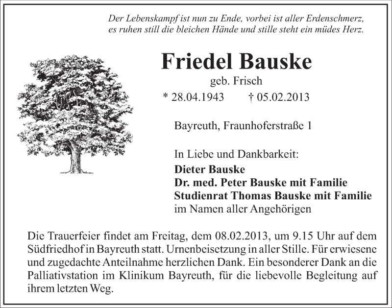 Hier finden Sie alle Traueranzeigen aus der Zeitung, die bisher für Friedel Bauske erschienen sind. Weitere Traueranzeigen, die in der Zeitung erscheinen, werden hier ebenfalls aufgelistet