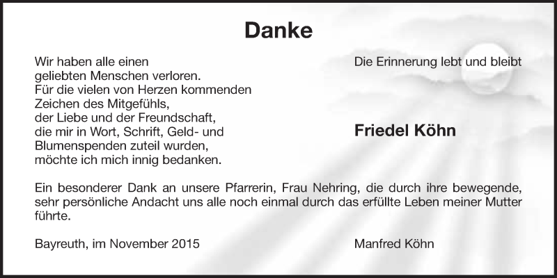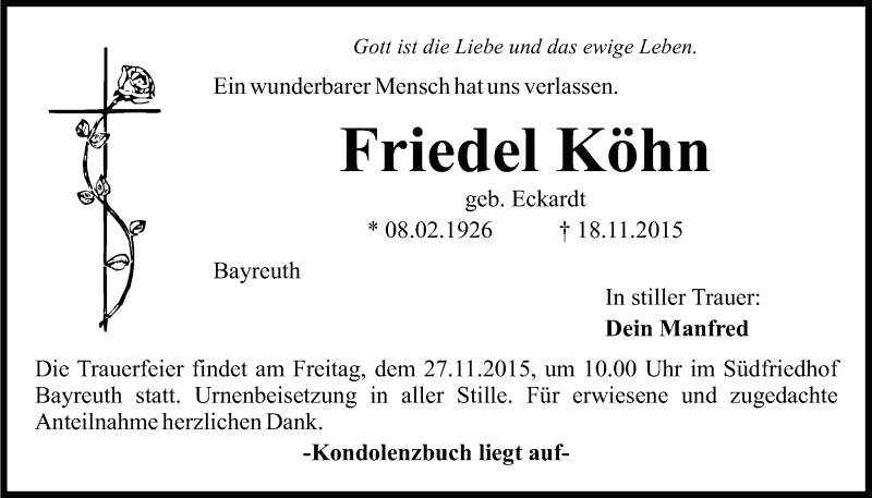 Hier finden Sie alle Traueranzeigen aus der Zeitung, die bisher für Friedel Köhn erschienen sind. Weitere Traueranzeigen, die in der Zeitung erscheinen, werden hier ebenfalls aufgelistet