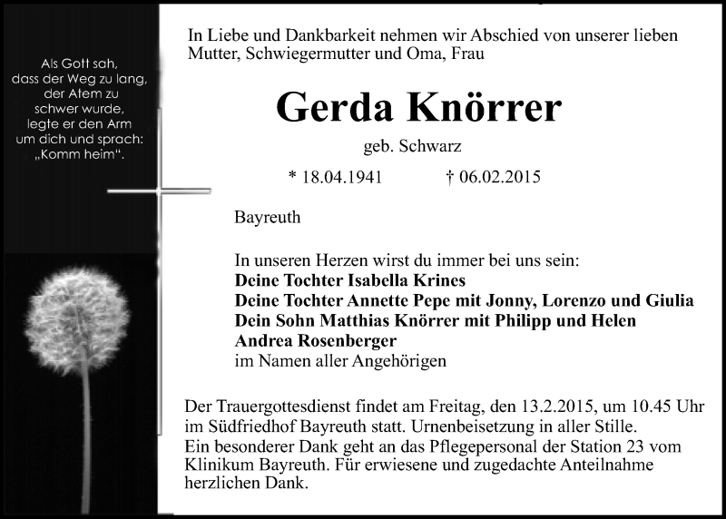 Hier finden Sie alle Traueranzeigen aus der Zeitung, die bisher für Gerda Knörrer erschienen sind. Weitere Traueranzeigen, die in der Zeitung erscheinen, werden hier ebenfalls aufgelistet