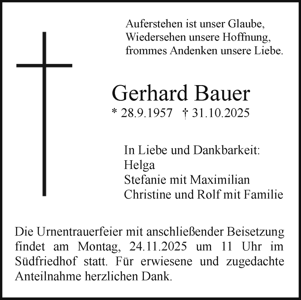 Hier finden Sie alle Traueranzeigen aus der Zeitung, die bisher für Gerhard Bauer erschienen sind. Weitere Traueranzeigen, die in der Zeitung erscheinen, werden hier ebenfalls aufgelistet