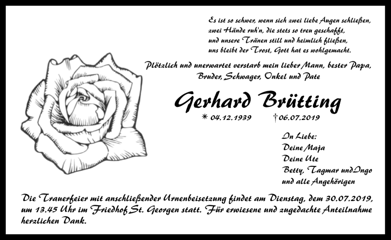 Hier finden Sie alle Traueranzeigen aus der Zeitung, die bisher für Gerhard Brütting erschienen sind. Weitere Traueranzeigen, die in der Zeitung erscheinen, werden hier ebenfalls aufgelistet