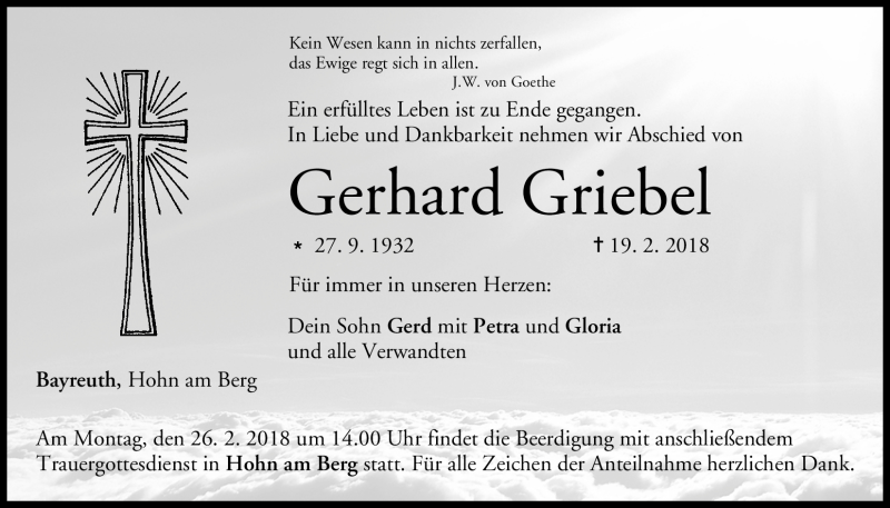 Hier finden Sie alle Traueranzeigen aus der Zeitung, die bisher für Gerhard Griebel erschienen sind. Weitere Traueranzeigen, die in der Zeitung erscheinen, werden hier ebenfalls aufgelistet