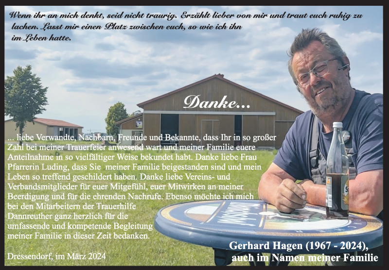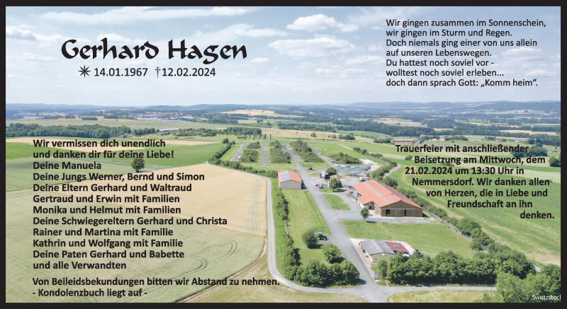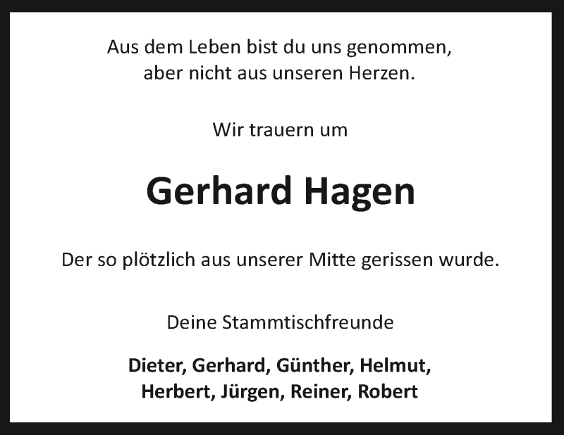 Hier finden Sie alle Traueranzeigen aus der Zeitung, die bisher für Gerhard Hagen erschienen sind. Weitere Traueranzeigen, die in der Zeitung erscheinen, werden hier ebenfalls aufgelistet