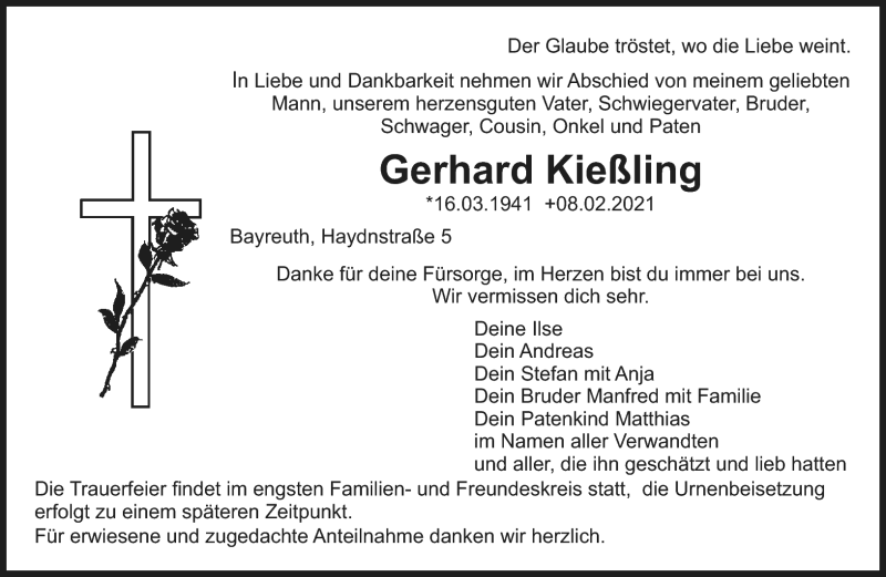 Hier finden Sie alle Traueranzeigen aus der Zeitung, die bisher für Gerhard Kießling erschienen sind. Weitere Traueranzeigen, die in der Zeitung erscheinen, werden hier ebenfalls aufgelistet