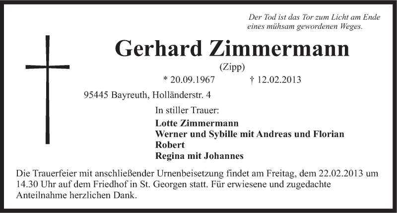 Hier finden Sie alle Traueranzeigen aus der Zeitung, die bisher für Gerhard Zimmermann erschienen sind. Weitere Traueranzeigen, die in der Zeitung erscheinen, werden hier ebenfalls aufgelistet