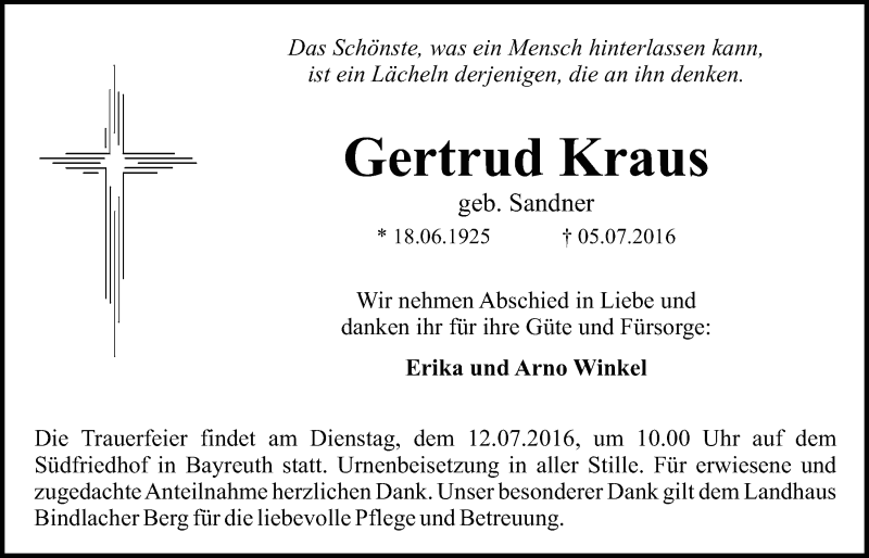 Hier finden Sie alle Traueranzeigen aus der Zeitung, die bisher für Gertrud Kraus erschienen sind. Weitere Traueranzeigen, die in der Zeitung erscheinen, werden hier ebenfalls aufgelistet