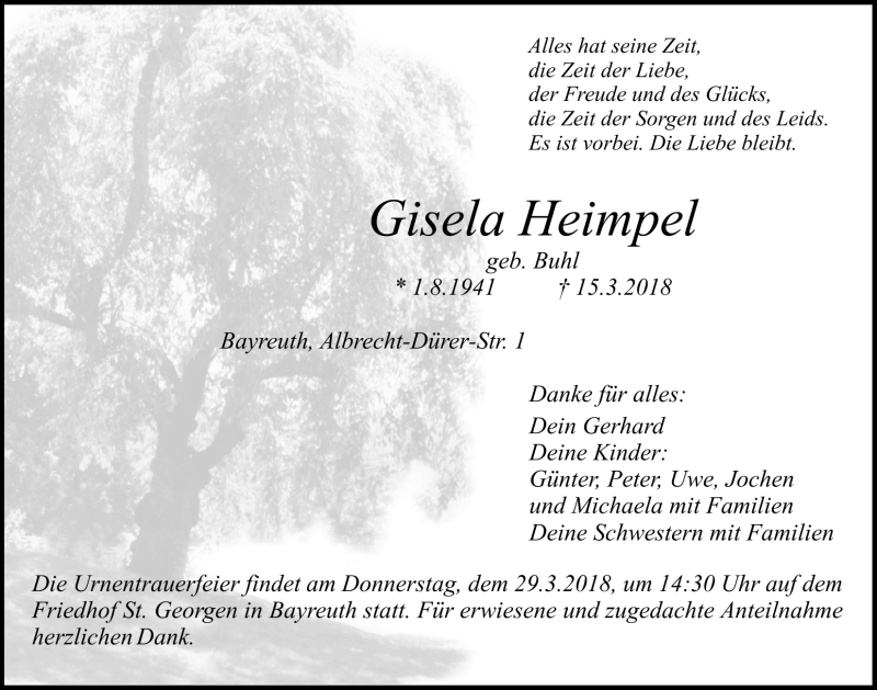 Hier finden Sie alle Traueranzeigen aus der Zeitung, die bisher für Gisela Heimpel erschienen sind. Weitere Traueranzeigen, die in der Zeitung erscheinen, werden hier ebenfalls aufgelistet