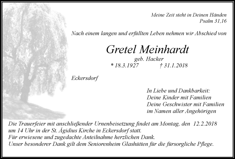 Hier finden Sie alle Traueranzeigen aus der Zeitung, die bisher für Gretel Meinhardt erschienen sind. Weitere Traueranzeigen, die in der Zeitung erscheinen, werden hier ebenfalls aufgelistet