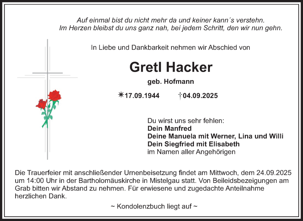 Hier finden Sie alle Traueranzeigen aus der Zeitung, die bisher für Gretl Hacker erschienen sind. Weitere Traueranzeigen, die in der Zeitung erscheinen, werden hier ebenfalls aufgelistet