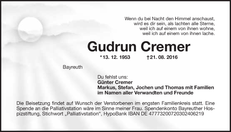 Hier finden Sie alle Traueranzeigen aus der Zeitung, die bisher für Gudrun Cremer erschienen sind. Weitere Traueranzeigen, die in der Zeitung erscheinen, werden hier ebenfalls aufgelistet