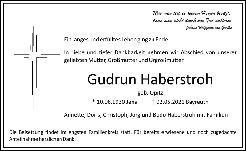 Hier finden Sie alle Traueranzeigen aus der Zeitung, die bisher für Gudrun Haberstroh erschienen sind. Weitere Traueranzeigen, die in der Zeitung erscheinen, werden hier ebenfalls aufgelistet
