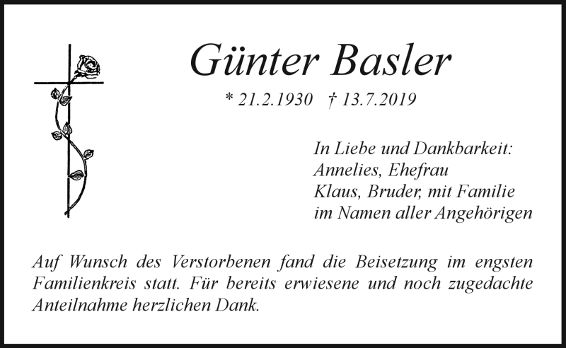 Hier finden Sie alle Traueranzeigen aus der Zeitung, die bisher für Günter Basler erschienen sind. Weitere Traueranzeigen, die in der Zeitung erscheinen, werden hier ebenfalls aufgelistet