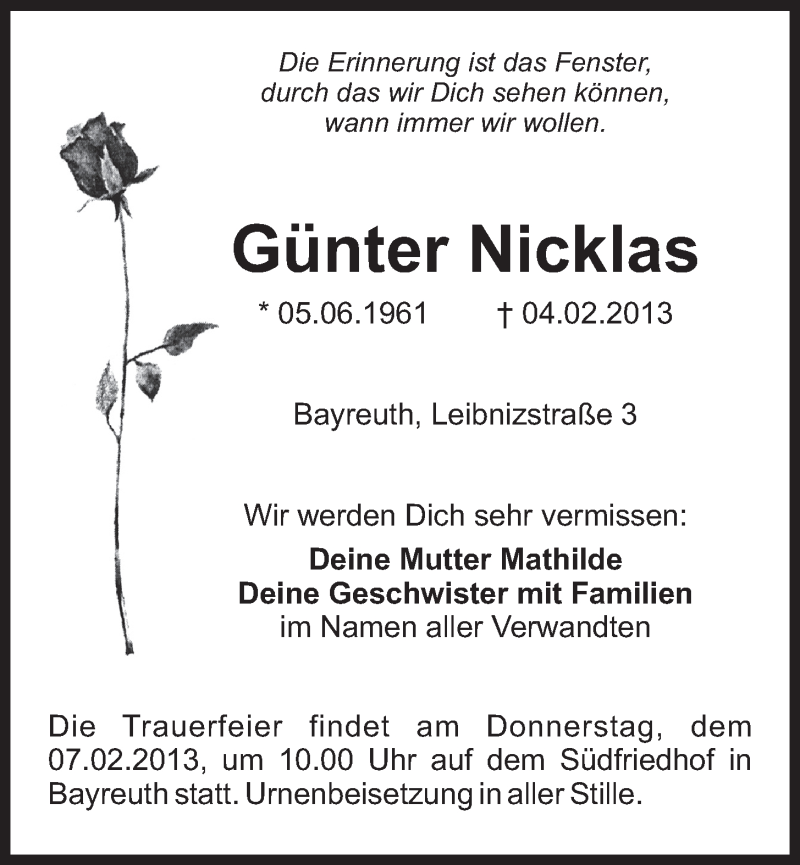 Hier finden Sie alle Traueranzeigen aus der Zeitung, die bisher für Günter Nicklas erschienen sind. Weitere Traueranzeigen, die in der Zeitung erscheinen, werden hier ebenfalls aufgelistet