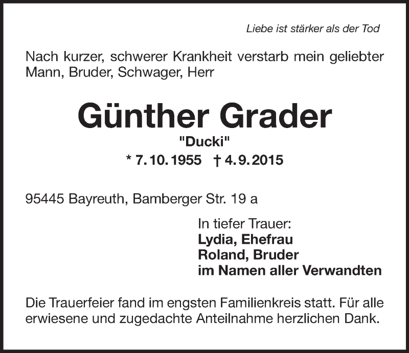 Hier finden Sie alle Traueranzeigen aus der Zeitung, die bisher für Günther Grader erschienen sind. Weitere Traueranzeigen, die in der Zeitung erscheinen, werden hier ebenfalls aufgelistet