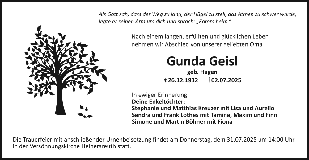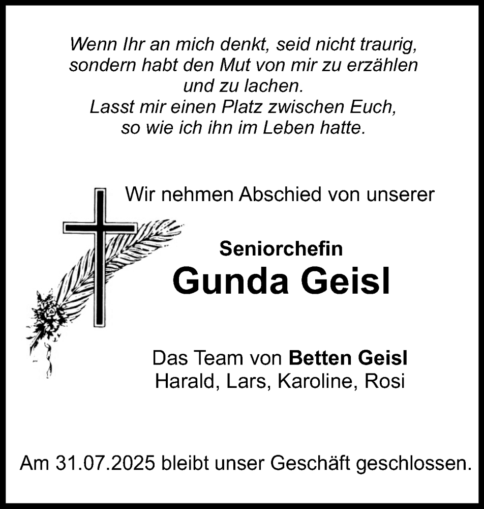 Hier finden Sie alle Traueranzeigen aus der Zeitung, die bisher für Gunda Geisl erschienen sind. Weitere Traueranzeigen, die in der Zeitung erscheinen, werden hier ebenfalls aufgelistet