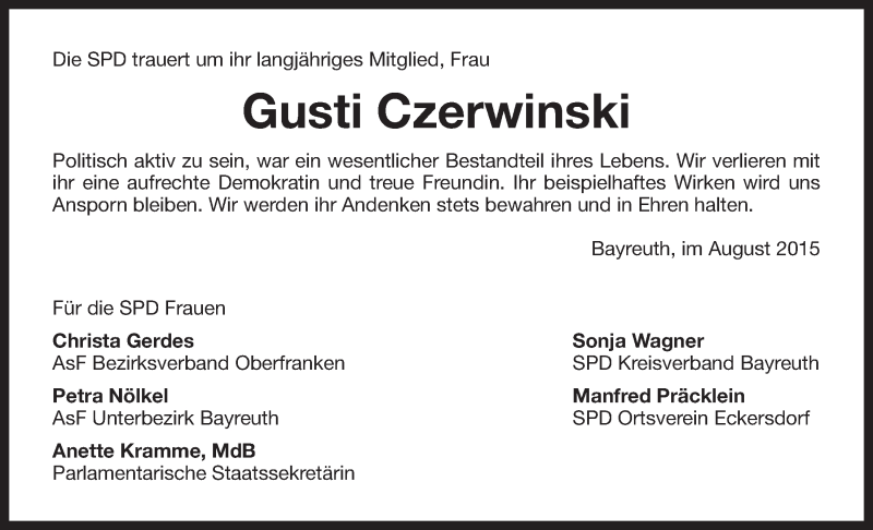 Hier finden Sie alle Traueranzeigen aus der Zeitung, die bisher für Gusti Czerwinski erschienen sind. Weitere Traueranzeigen, die in der Zeitung erscheinen, werden hier ebenfalls aufgelistet
