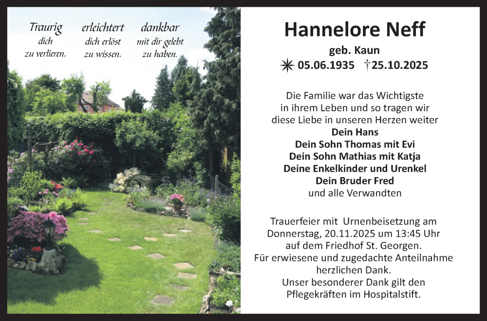 Hier finden Sie alle Traueranzeigen aus der Zeitung, die bisher für Hannelore Neff erschienen sind. Weitere Traueranzeigen, die in der Zeitung erscheinen, werden hier ebenfalls aufgelistet