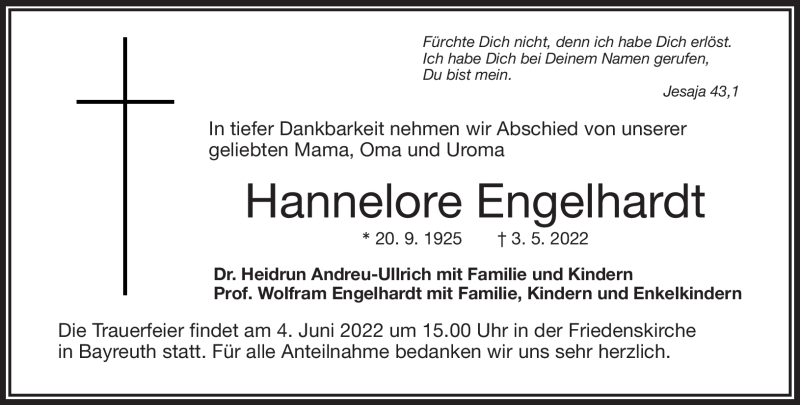 Hier finden Sie alle Traueranzeigen aus der Zeitung, die bisher für Hannlore Engelhardt erschienen sind. Weitere Traueranzeigen, die in der Zeitung erscheinen, werden hier ebenfalls aufgelistet