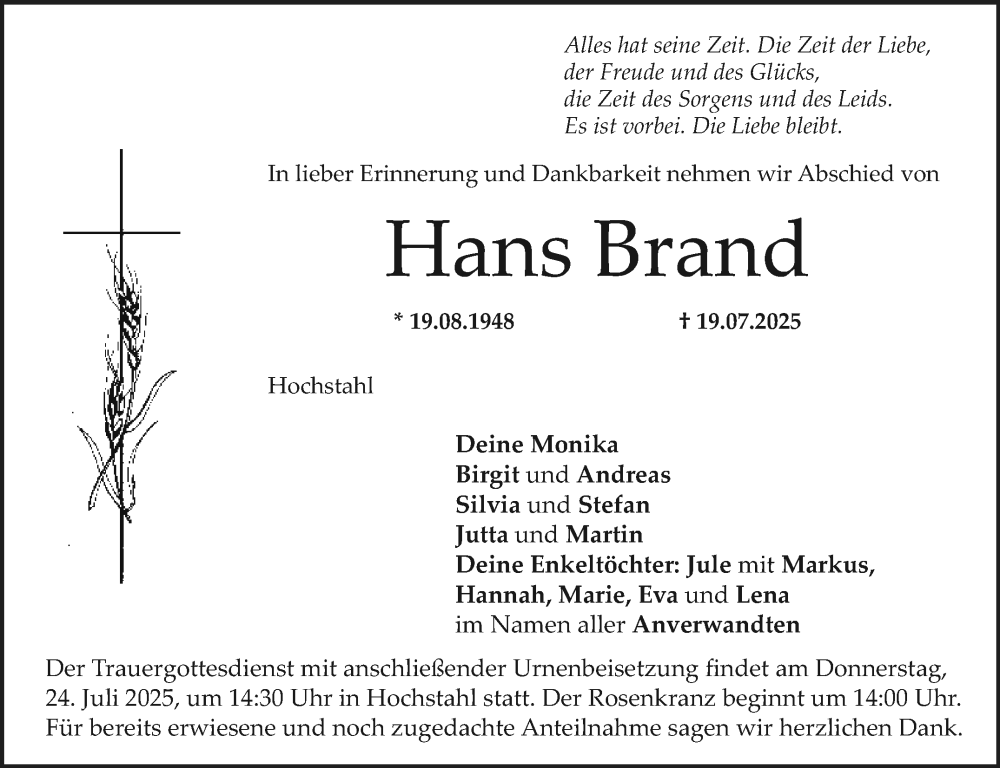 Hier finden Sie alle Traueranzeigen aus der Zeitung, die bisher für Hans Brand erschienen sind. Weitere Traueranzeigen, die in der Zeitung erscheinen, werden hier ebenfalls aufgelistet