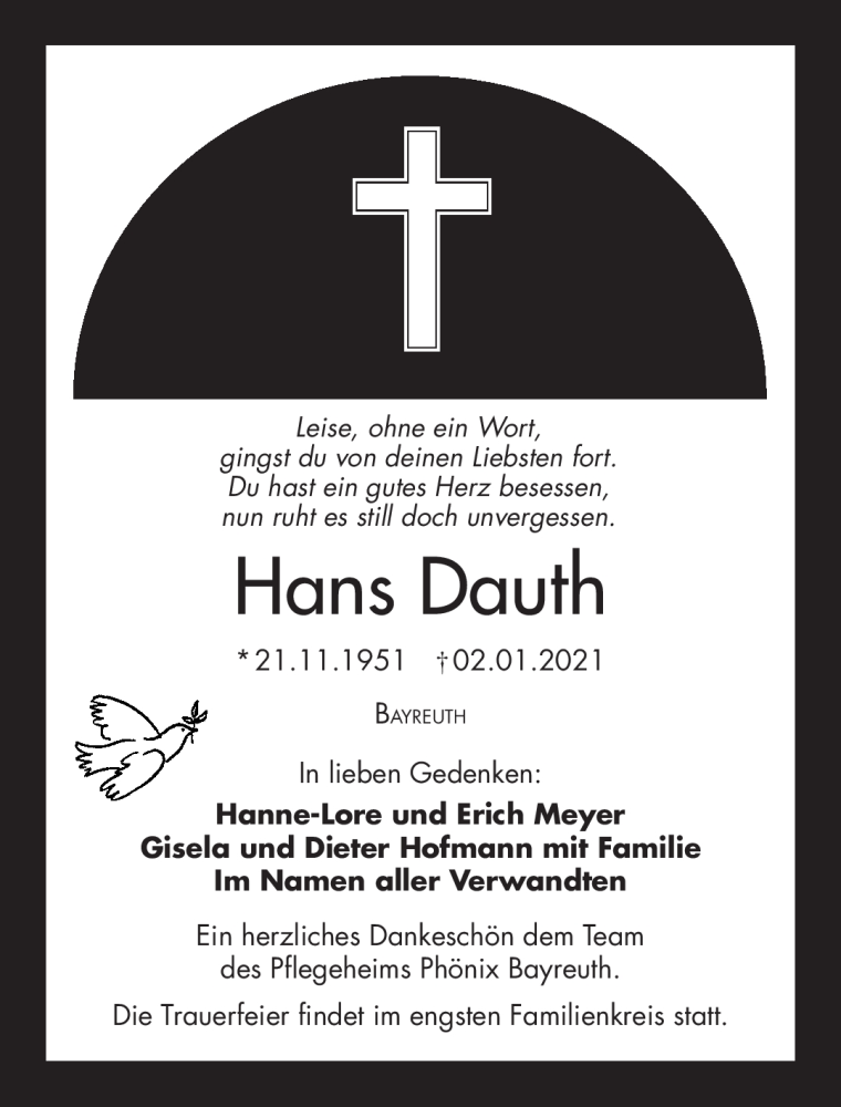 Hier finden Sie alle Traueranzeigen aus der Zeitung, die bisher für Hans Dauth erschienen sind. Weitere Traueranzeigen, die in der Zeitung erscheinen, werden hier ebenfalls aufgelistet