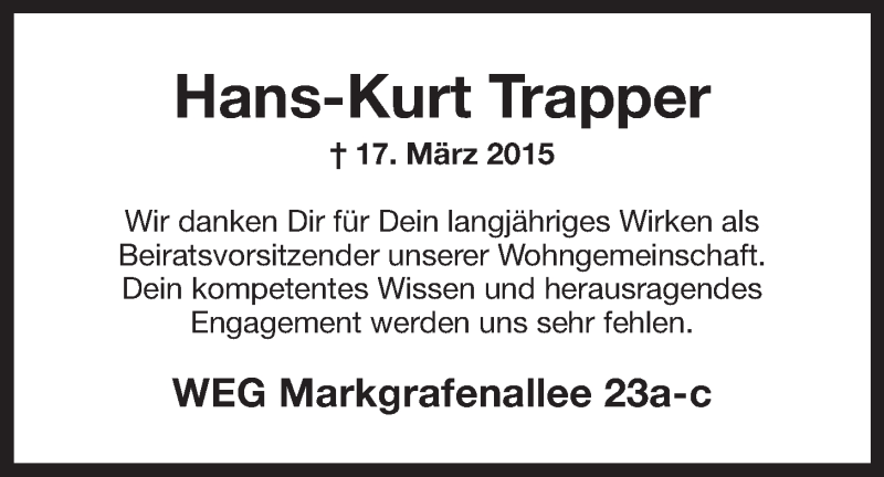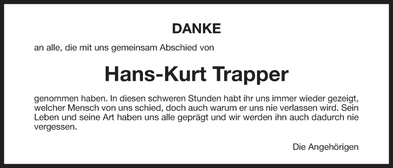Hier finden Sie alle Traueranzeigen aus der Zeitung, die bisher für Hans-Kurt Trapper erschienen sind. Weitere Traueranzeigen, die in der Zeitung erscheinen, werden hier ebenfalls aufgelistet