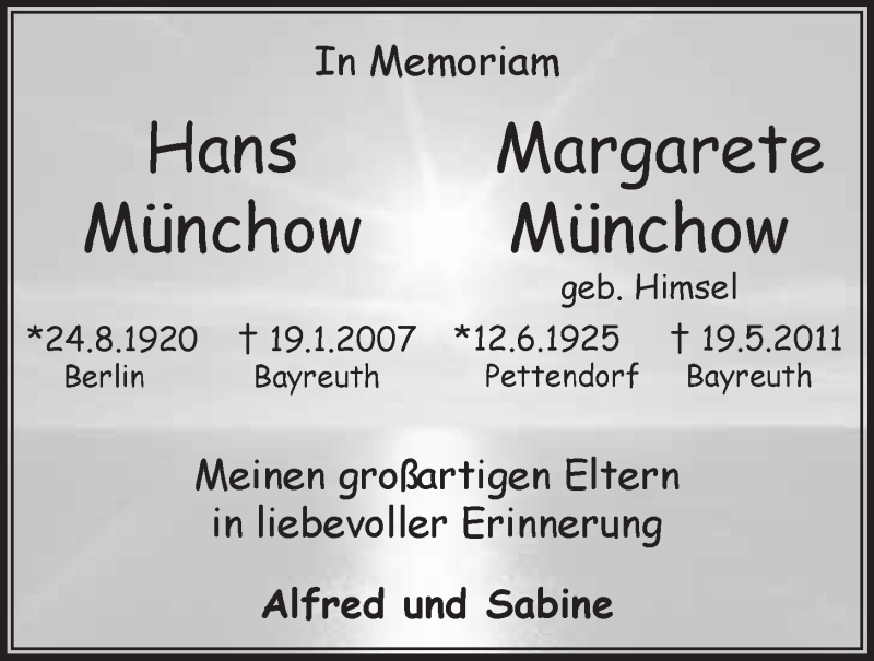 Hier finden Sie alle Traueranzeigen aus der Zeitung, die bisher für Hans und Margarete Münchow erschienen sind. Weitere Traueranzeigen, die in der Zeitung erscheinen, werden hier ebenfalls aufgelistet