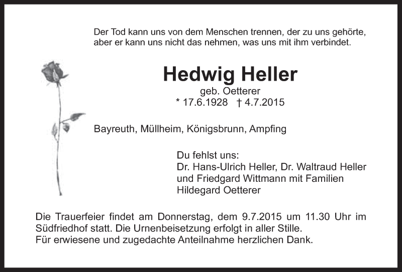 Hier finden Sie alle Traueranzeigen aus der Zeitung, die bisher für Hedwig Heller erschienen sind. Weitere Traueranzeigen, die in der Zeitung erscheinen, werden hier ebenfalls aufgelistet