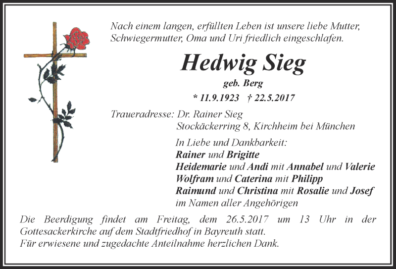 Hier finden Sie alle Traueranzeigen aus der Zeitung, die bisher für Hedwig Sieg erschienen sind. Weitere Traueranzeigen, die in der Zeitung erscheinen, werden hier ebenfalls aufgelistet