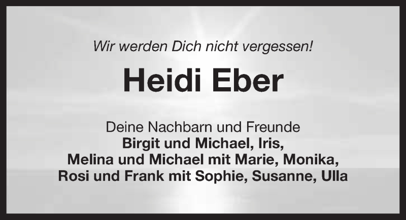 Hier finden Sie alle Traueranzeigen aus der Zeitung, die bisher für Heidi Eber erschienen sind. Weitere Traueranzeigen, die in der Zeitung erscheinen, werden hier ebenfalls aufgelistet
