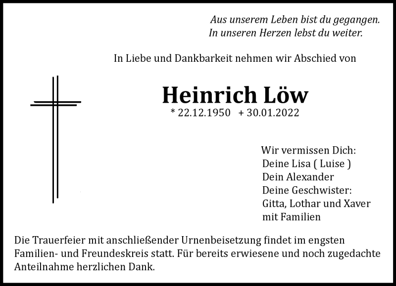 Hier finden Sie alle Traueranzeigen aus der Zeitung, die bisher für Heinrich Löw erschienen sind. Weitere Traueranzeigen, die in der Zeitung erscheinen, werden hier ebenfalls aufgelistet