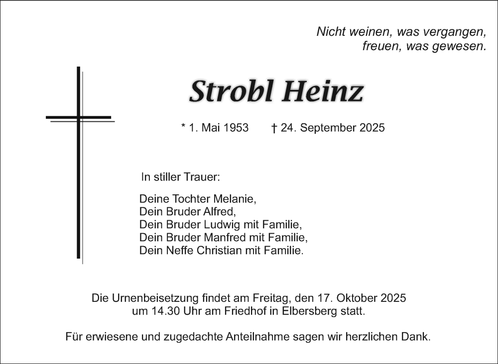 Hier finden Sie alle Traueranzeigen aus der Zeitung, die bisher für Heinz Strobl erschienen sind. Weitere Traueranzeigen, die in der Zeitung erscheinen, werden hier ebenfalls aufgelistet
