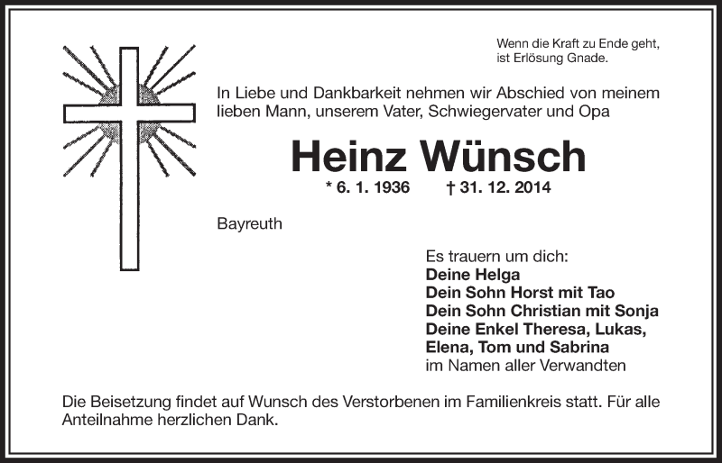 Hier finden Sie alle Traueranzeigen aus der Zeitung, die bisher für Heinz Wünsch erschienen sind. Weitere Traueranzeigen, die in der Zeitung erscheinen, werden hier ebenfalls aufgelistet