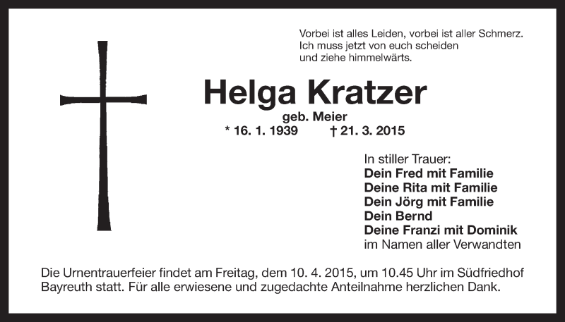 Hier finden Sie alle Traueranzeigen aus der Zeitung, die bisher für Helga Kratzer erschienen sind. Weitere Traueranzeigen, die in der Zeitung erscheinen, werden hier ebenfalls aufgelistet