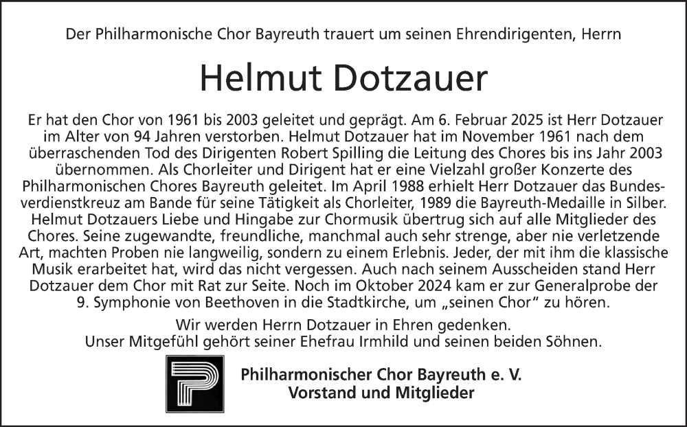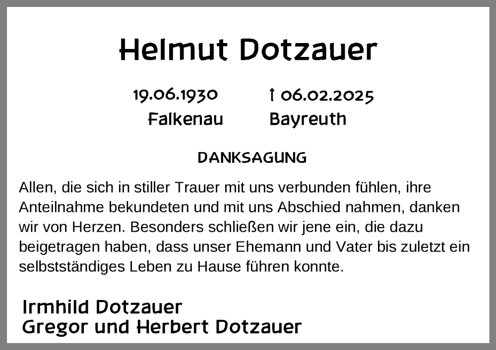 Hier finden Sie alle Traueranzeigen aus der Zeitung, die bisher für Helmut Dotzauer erschienen sind. Weitere Traueranzeigen, die in der Zeitung erscheinen, werden hier ebenfalls aufgelistet