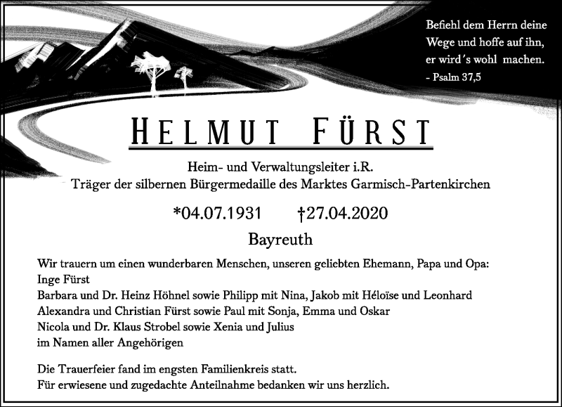 Hier finden Sie alle Traueranzeigen aus der Zeitung, die bisher für Helmut Fürst erschienen sind. Weitere Traueranzeigen, die in der Zeitung erscheinen, werden hier ebenfalls aufgelistet