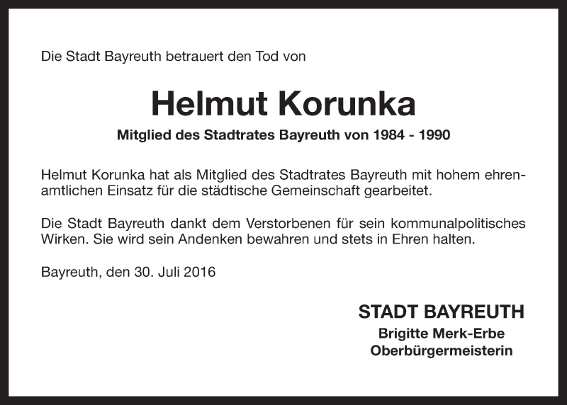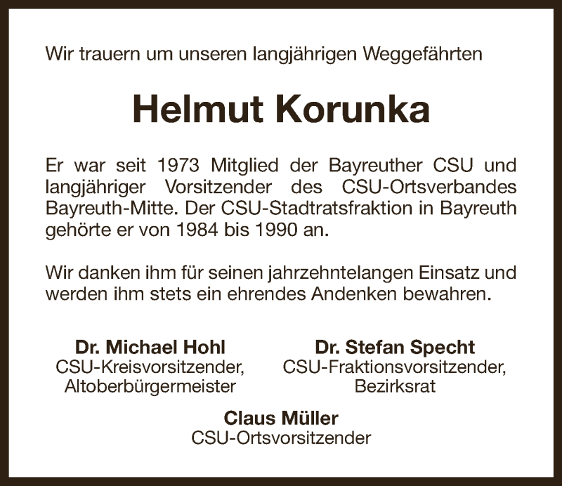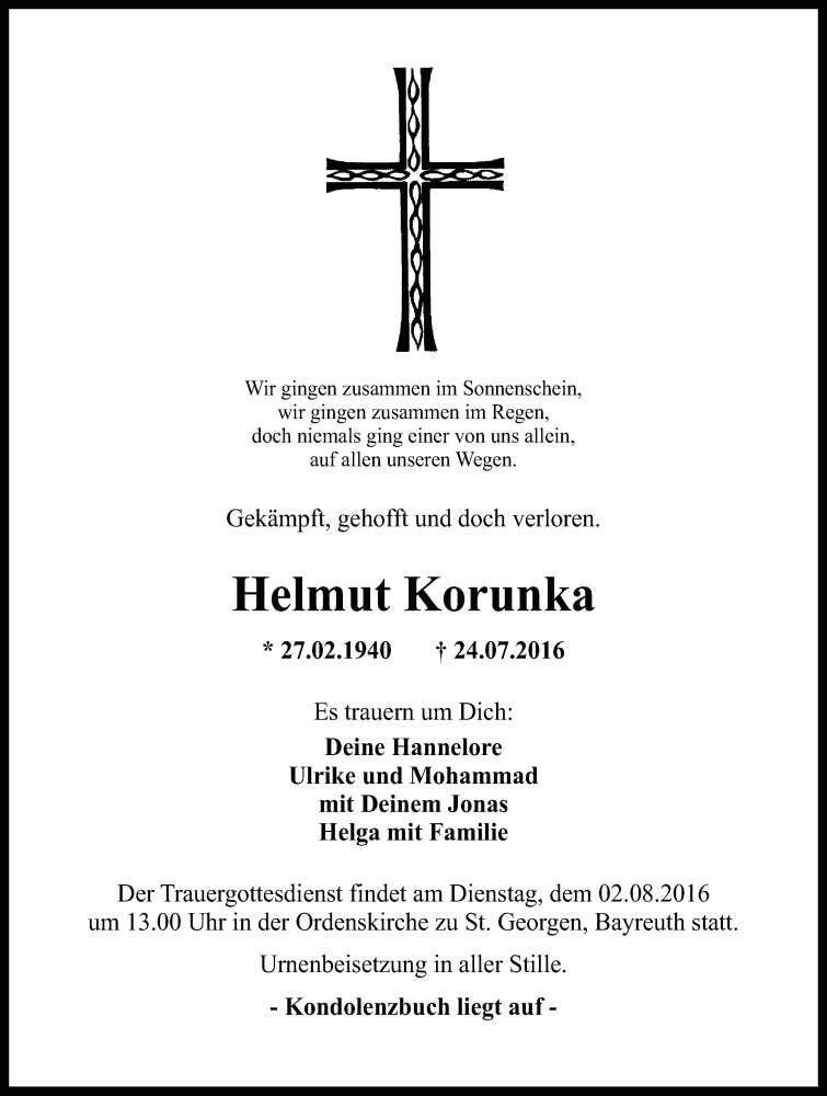 Hier finden Sie alle Traueranzeigen aus der Zeitung, die bisher für Helmut Korunka erschienen sind. Weitere Traueranzeigen, die in der Zeitung erscheinen, werden hier ebenfalls aufgelistet